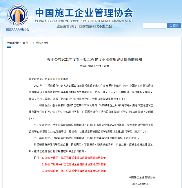 近日,在中國施工企業管理協會召開的2021年度工程建設誠信企業推介大會上,公司再次獲得 “2021年度工程建設AAA信用等級企業”和“2021年工程信用7星級企業”等共二項榮譽,這也是“十四五”開局之年公司全面貫徹新發展理念、構建信用新發展格局在行業信用體系建設方面取得的突出成效。2021年,公司不斷完善信用體系,強化信用導向,企業管理水平和社會信譽度不斷提升。今后公司將以此為契機,不斷總結經驗,補齊發展短板,助力企業高質量發展。