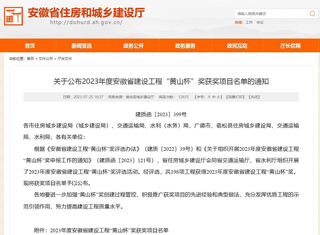 7月25日,省住建廳公布2023年度安徽省建設工程“黃山杯”獎獲獎項目名單,黃山建工承建的黃山職業技術學院風雨操場項目工程位列榜單、喜獲殊榮。