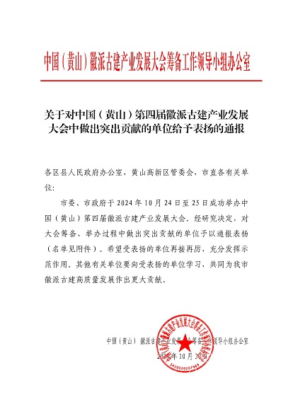 市委、市政府于2024年10月24日至25日成功舉辦中國(黃山)第四屆徽派古建產(chǎn)業(yè)發(fā)展大會。近日,中國(黃山)徽派古建產(chǎn)業(yè)發(fā)展大會籌備工作領(lǐng)導小組辦公室發(fā)布《關(guān)于對中國(黃山)第四屆徽派古建產(chǎn)業(yè)發(fā)展大會中做出突出貢獻的單位給予表揚的通報》,黃山建工集團榮列其中。