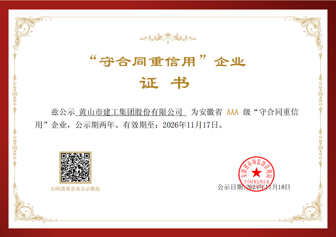 近日,黃山建工集團憑借健全的信用管理體系、優良的合同履約信用狀況和良好的市場信譽榮獲安徽省AAA級“守合同重信用”企業稱號。這一榮譽的獲得,不僅是對黃山建工集團在企業經營過程中始終堅持誠信經營的肯定,也是對黃山建工集團在合同履行和信用管理方面所取得的顯著成績的認可。