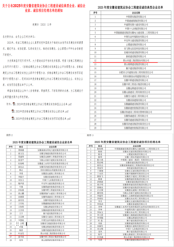 在安徽省建筑業(yè)協(xié)會同期開展的2025年度評選中,黃山市建工集團股份有限公司被授予 “2025年度安徽省工程建設誠信典型企業(yè)” 榮譽稱號。這是對我公司長期以來遵守市場秩序、嚴格合同履約、積極承擔社會責任等方面表現的褒獎。